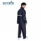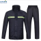 为分体双层套装雨衣,包括上衣、裤子,上衣为拉链门襟休闲款式,双层设计,有里衬,松紧带裤腰,加长防水透明帽檐。
